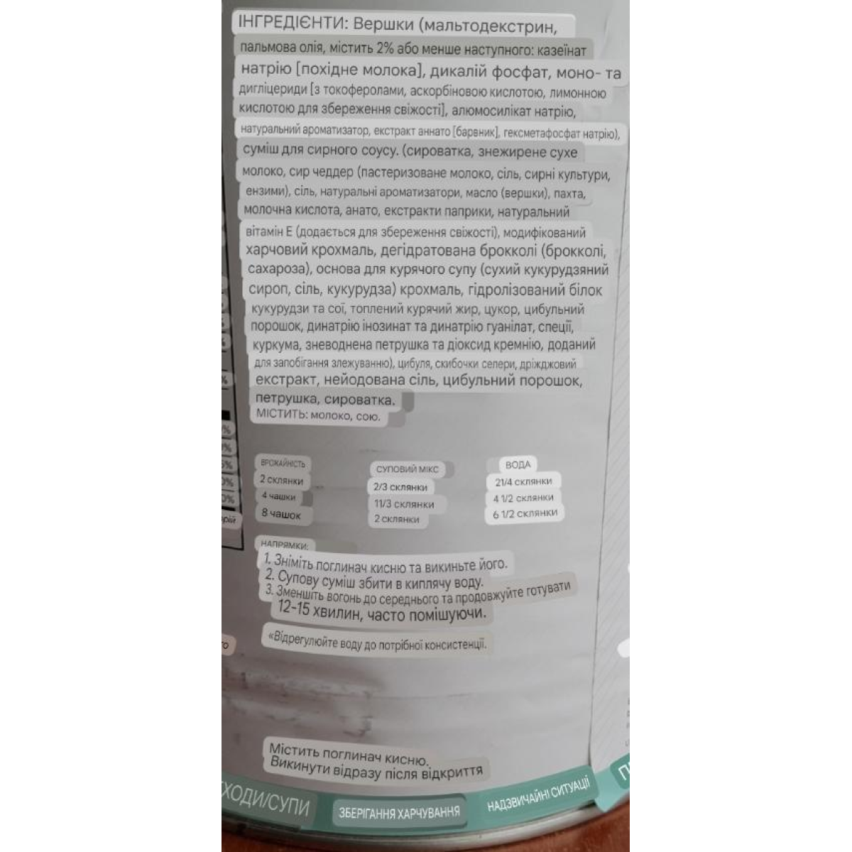 Суміш сиру чедер (сир чедер [пастеризоване молоко, сіль, анато, сирні культури, ферменти], сироватка, пальмова олія, мальтодекстрин, сіль, блакитний сир [пастеризоване молоко, сіль, сирні культури, ферменти], натуральні ароматизатори, молочна кислота, лимонна кислота, динатрій інозинат і динатрій гуанілат, жовтий 5, жовтий 6), кукурудзяний крохмаль, порошкоподібні вершки (кокосова олія, сухі речовини кукурудзяного сиропу, казеїнат натрію [продуктивне молоко], дикалійфосфат, цукор, моно- та дігліцериди, діоксид кремнію, полісорбат 80, тетранатрийпірофосфат, соєвий лецитин), збагачене пшеничне борошно (ніацин, відновлене залізо, мононітрат тіаміну, рибофлавін, фолієва кислота, фермент), сироватка, броколі*, знежирений сухий Молоко, сіль, цибуля*, цибулевий порошок, цукор, спеції, порошок молочної кислоти (молочна кислота, лактат кальцію з вмістом діоксиду кремнію менш ніж 2%). Зневоднений* Містить: молоко, сою, пшеницю