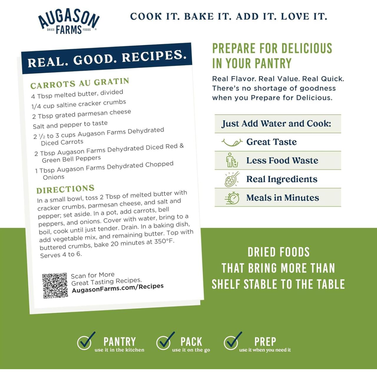 УНІВЕРСАЛЬНА НЕОБХОДЖІСТЬ ДЛЯ КУЛІНАРІЇ: сушені овочі Augason Farms є універсальною добавкою до супів, рагу, запеканок та багатьох інших страв, надаючи вашим улюбленим рецептам чудовий, свіжий смак саду.