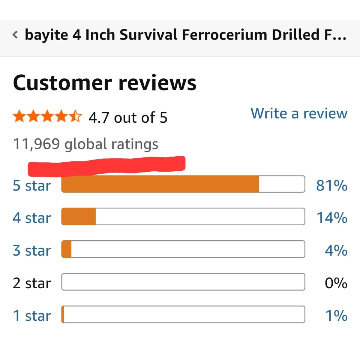 Кремневе освітлення Bayite завдовжки 4 дюйми з фероцерієвим свердлом, набір із феростерня з ручкою з паракорду та бойком, довжина 10 см x діаметр 1 см Одна з найпопулярніших і рейтингових моделей на Amazon (США), дивись фото 2. До комплекту входить паракорд завдовжки 5 футів, який забезпечує надійне захоплення й ніколи не зісковзує. У комплекті з паракордом Bayite Striker-Pro, який можна використовувати для розпалювання вогню. Бойлер Bayite Striker-Pro з 6 ударними крайками виготовлений з інструментальної швидкорізальної сталі високої твердості та забезпечує максимальну кількість гарячих іскрів, незалежно від того, якою рукою ви віддаєте перевагу роботі. Не використовуйте як бойка ніж низької якості. Інакше через недостатню твердість леза іскор буде недостатньо. Довжина фероцерієвого стрижня: 4 дюйми (10 см). Діаметр: 3/8 дюйма (10 мм). Досить великий, щоб висікати іскри, і досить маленький, щоб носити із собою. Виготовлений із високоефективного фероцерієвого стрижня. Водонепроникний і всепогодний, підходить для будь-яких погодних умов. Ікри розлітаються за температури 3000 °C (5500 °F), даючи змогу розпалити вогонь у будь-яку погоду (навіть у сиру погоду) і на будь-якій висоті. Як використовувати Перед першим використанням зішкребіть покриття, щоб оголити блискучий метал. Тримайте феромагнітний стрижень поруч із трутом під кутом приблизно 45 градусів. Помістіть скребок ближче до верхівки стрижня. Повільним і рівномірним рухом потягніть стрижень назад (від труту).