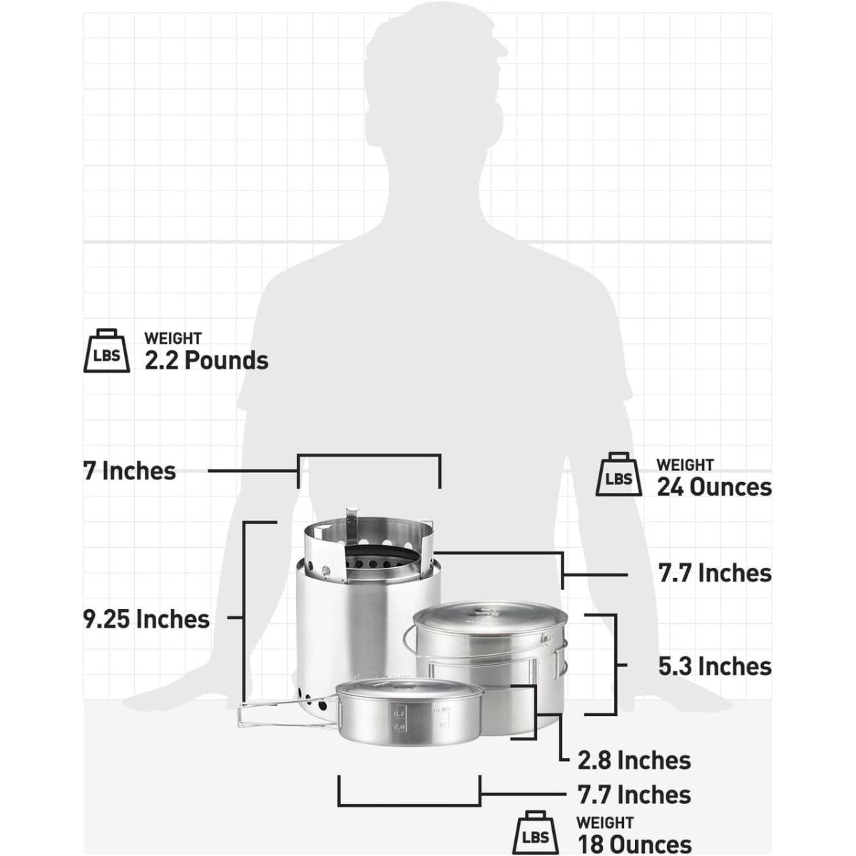 Solo Stove 2 Pot Set (США) Набір котелків 3 л + 1,5 л (як на головному фото) До комплекту входить нейлоновий чорний чохол із затяжкою. Ця конструкція довговічна та виготовлена з високоякісної харчової неіржавкої сталі 304. Характеристики набору з 2 горщиків 01. Проста у використанні кришка 02. Складана знімна дужка 03. Маркування обсягу OZ/ML 04. Вентиляційні отвори 05. Подвійні складані ручки Технічні характеристики набору Solo Stove з 2 горщиків Каструля 3 л: Висота 13,5 см; Діаметр 19,5 см; Вага: 724 г; Каструля 1,5 л: Висота 6,5 см; Діаметр 19,5 см; Вага: 552 гр. Вага комплекту: 1,27 кг. До комплекту Solo Stove 2 Pot Set легко входить похідна піч Solo Stove Campfire (купується окремо), що дає змогу звільнити більше місця у вашому рюкзаку.