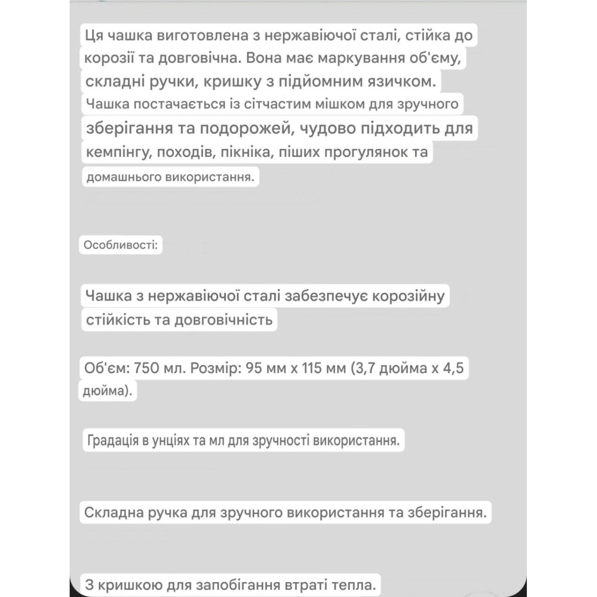 Казанок кухоль 750 мл сталь Lixada