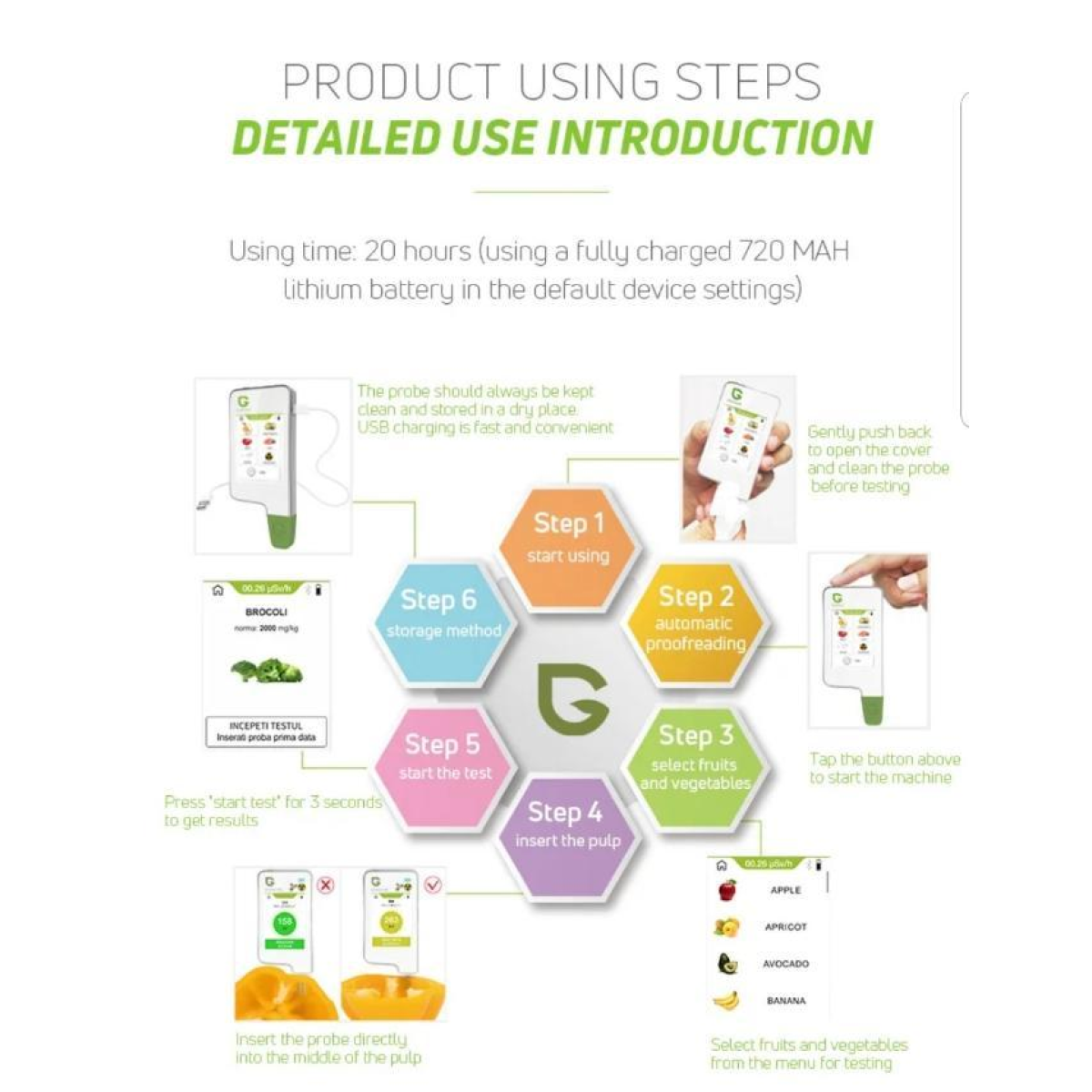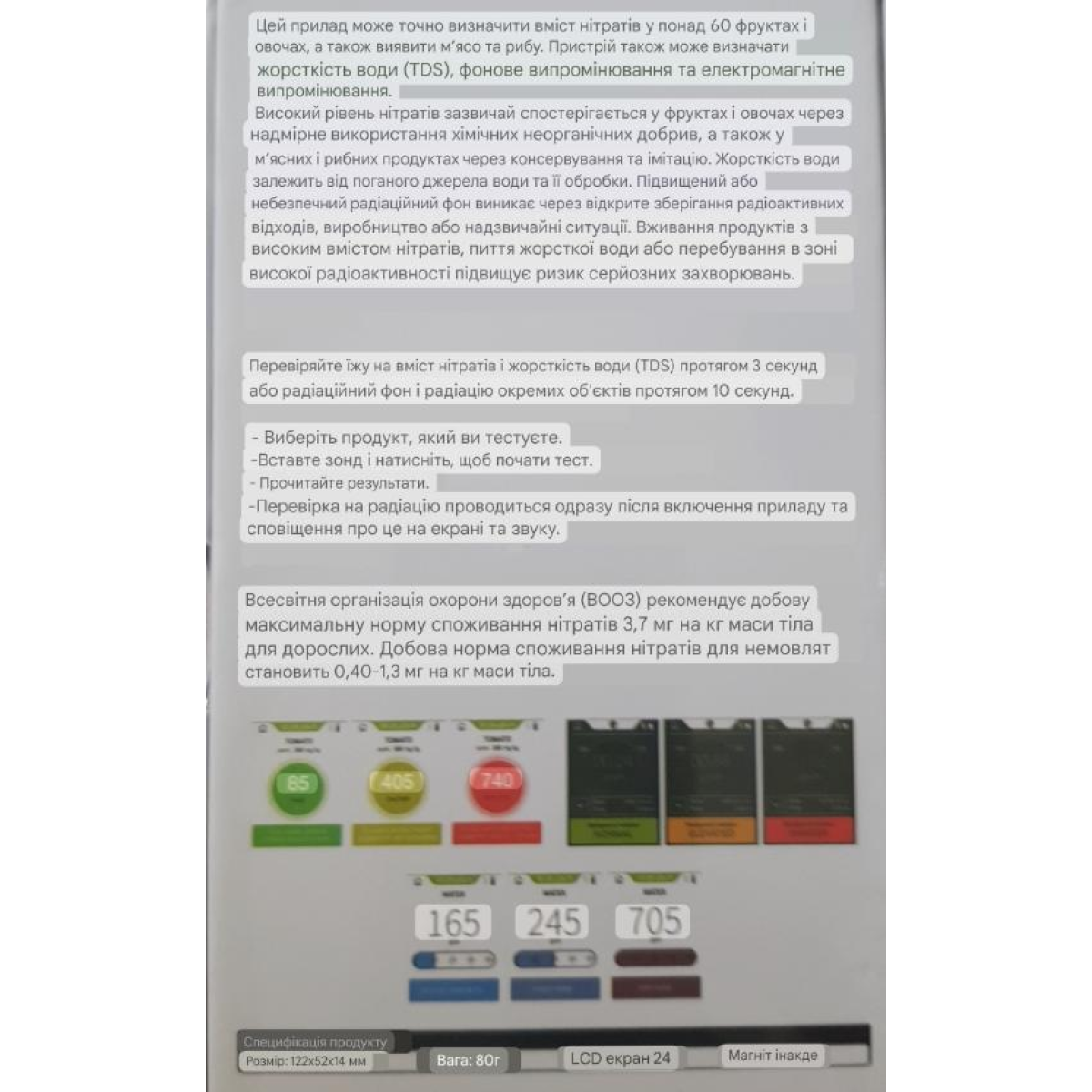 Багатофункціональний тестер -фрукти -овочі -рыба -м“ясо -вода -рівень радіації Вага 85 грамів Розмір: 12,5см/5см/1,4см Аккумулятор литий 720 мАч Заряджання USB 5вольтів Час роботи 20 годин Робоча температура 0-60 градусів за Цельсієм Матер“яний чохол