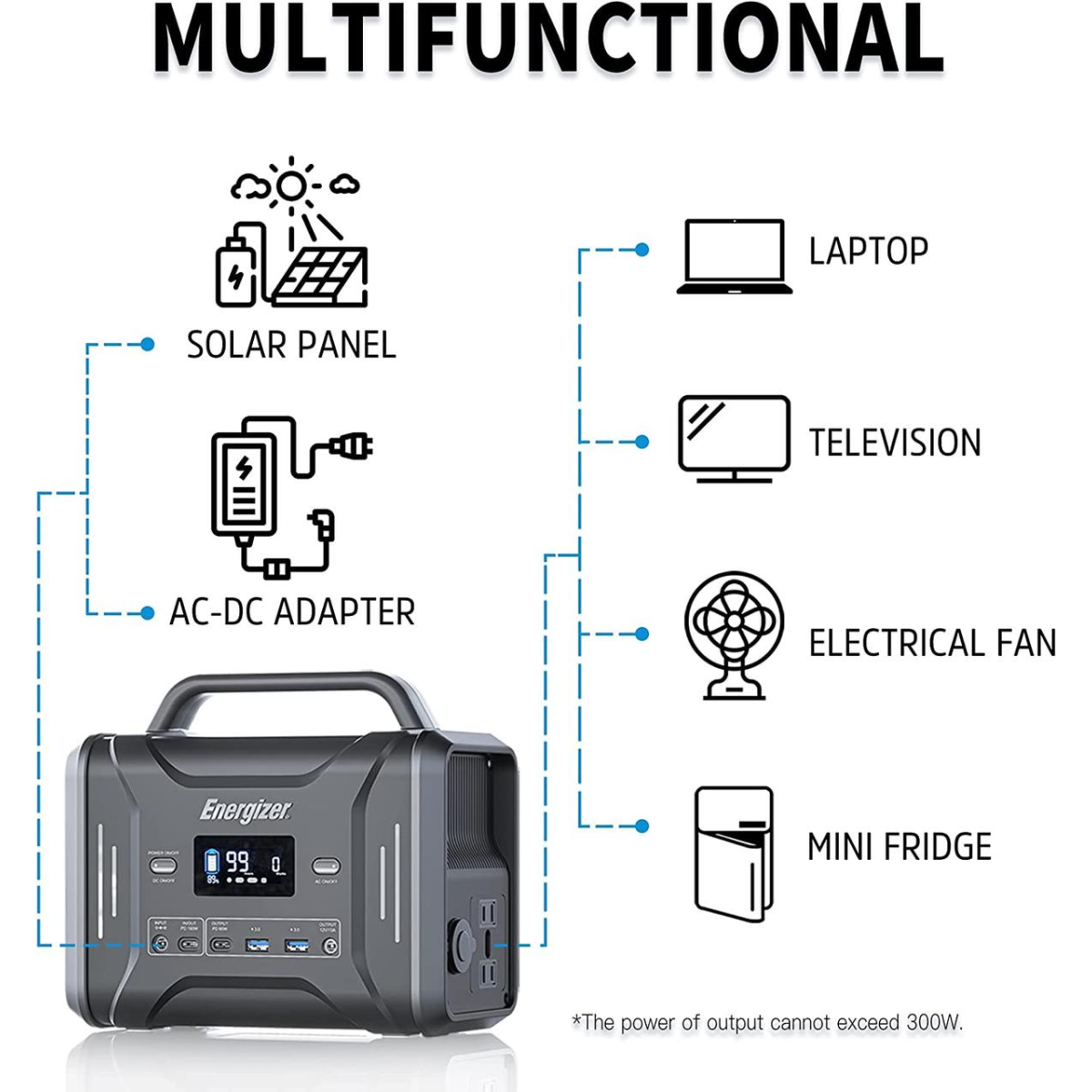 【ВИ ПОЛУЧАЄТЕ】: 1* портативна електростанція Energizer 300 Вт, 1* адаптер змінного струму, 1* автомобільний зарядний пристрій, 1*кабель для заряджання TYPE-C, 1*кабель для заряджання MC4, 1* посібник користувача.