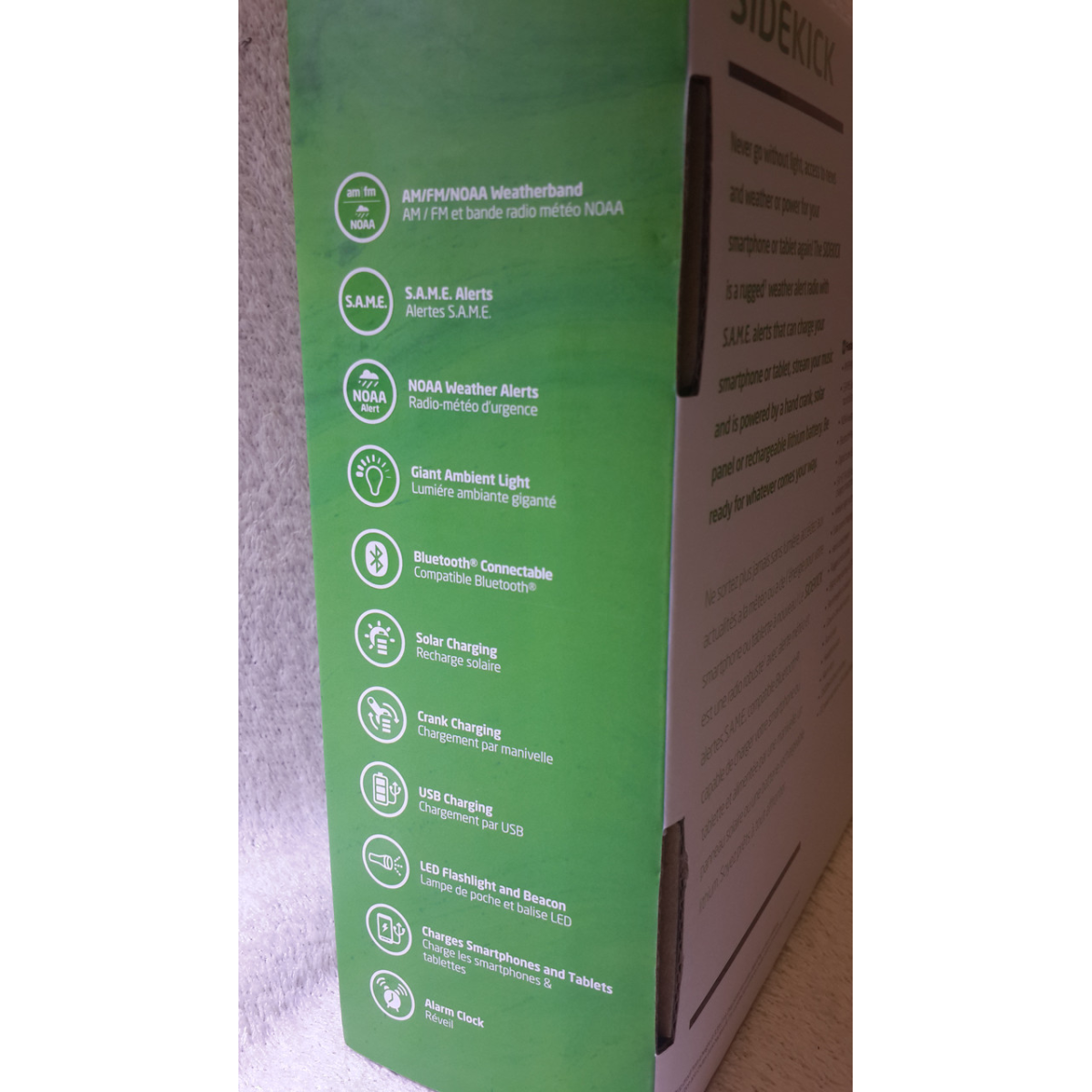 “Надій міцний, перезаряджуваний і надійний радіоприймач для сповіщення про погоду, не кажучи вже про живлення від сонячної батареї, захист від бризок, заряджання смартфона та планшета, потокове передавання Bluetooth і S.A.M.E. Технології? Sidekick — це просто квиток. Завдяки літієвій батареї, що перезаряджається, суперпуперській сонячній панелі та ручному електрогенератору він незамінний у будь-якому аварійному комплекті — вдома, на вулиці або на свіжому повітрі. Будьте в курсі подій із цим цифровим радіо AM/FM з дисплеєм і будильником. Якщо вам потрібно більше, ніж просто радіо, він підтримує Bluetooth і має додатковий вхід для відтворення ваших власних мелодій або прослуховування улюбленого подкасту. А якщо ви хочете слухати на самоті, просто під“єднайте свої улюблені навушники. Гігантська сонячна панель повністю зарядить акумулятор за 5-6 годин. Шукаєте альтернативні джерела енергії? Поверніть ручку Turbine на чотири хвилини, і ви зробите достатньо енергії для 10-15 хвилин прослуховування музики, новин і погоди або однієї хвилини розмови. Ви також можете використовувати кабель MicroUSB для заряджання вбудованої акумуляторної батареї Sidekick.