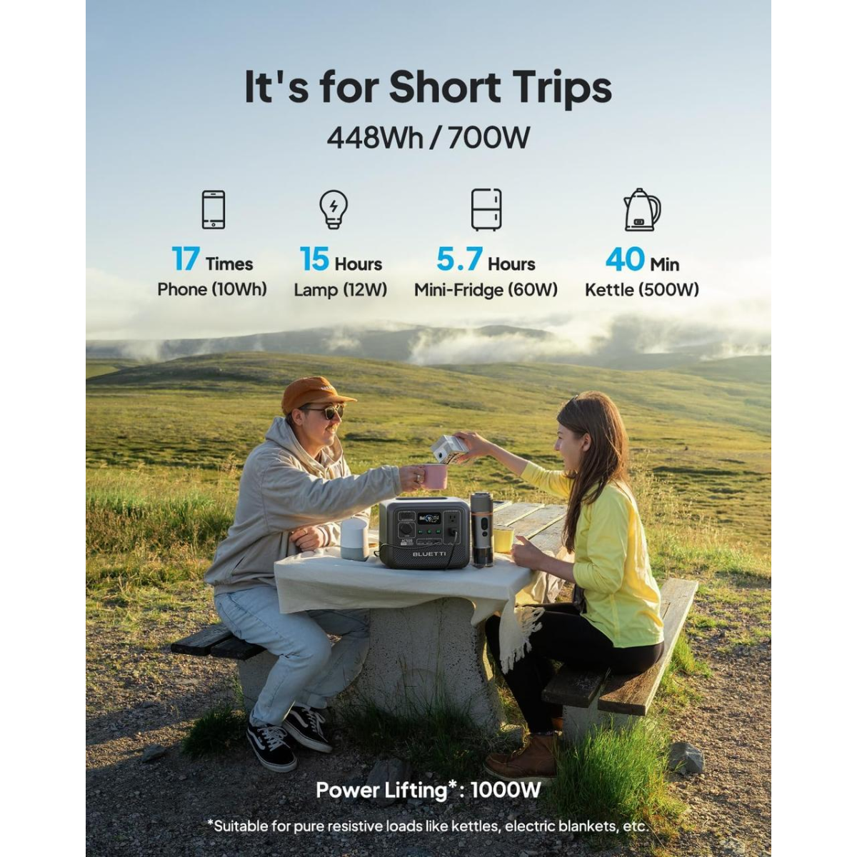 [Необхідне для кемпінгу] — З потужністю 448 Вт·год і вихідною потужністю 700 Вт ця портативна електростанція заряджає ваш телефон, ноутбук і спорядження для кемпінгу. Завдяки вазі всього 6.7 кг ви можете упакувати цей пристрій для походу в гори.