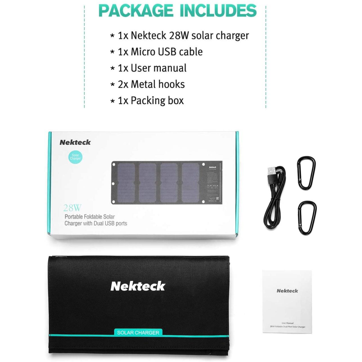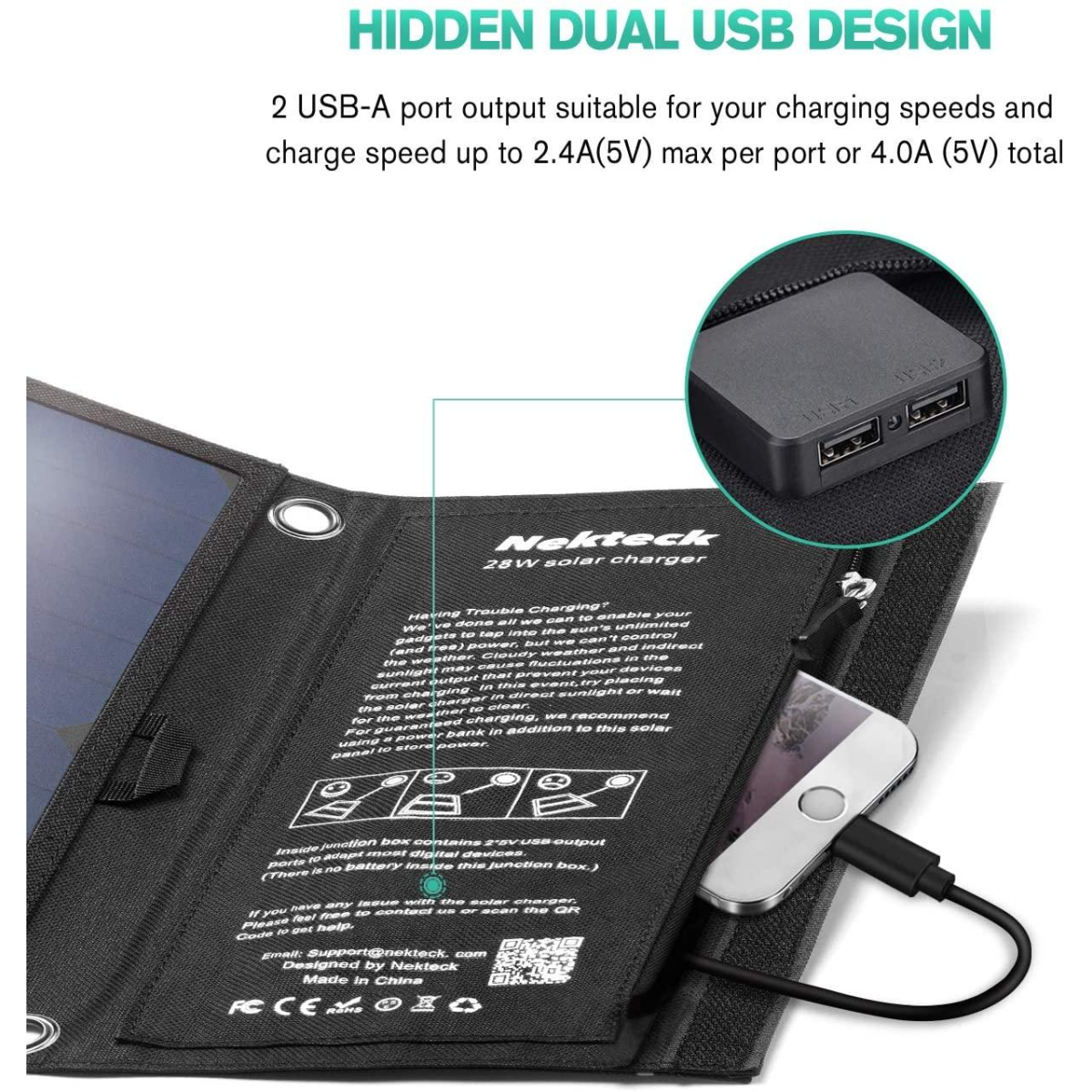 Сонячний зарядний пристрій Nekteck 28 Вт, портативна сонячна панель із 2 портами USB, водонепроникний зарядний пристрій IPX4 для походів, походів, зарядний пристрій на сонячній енергії.