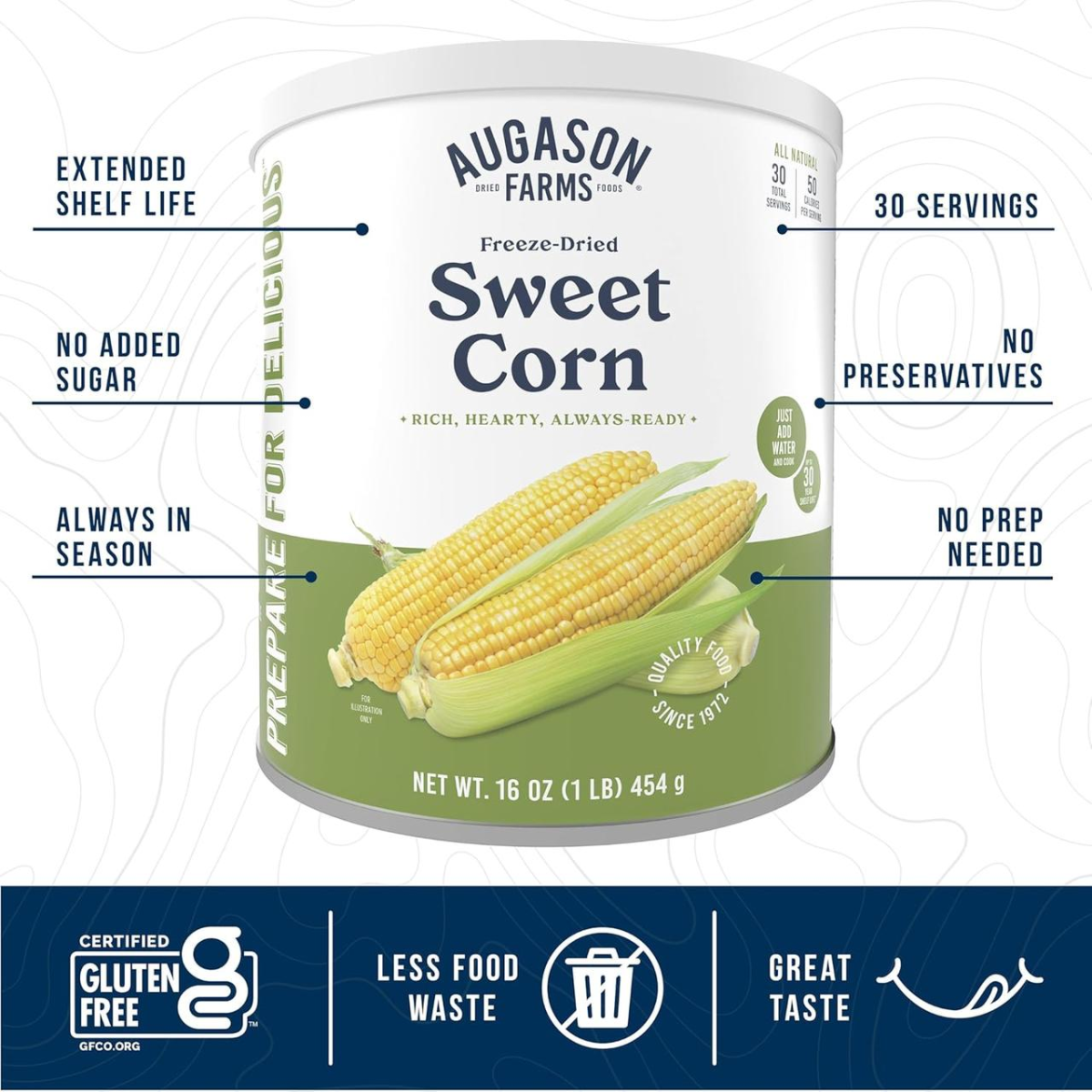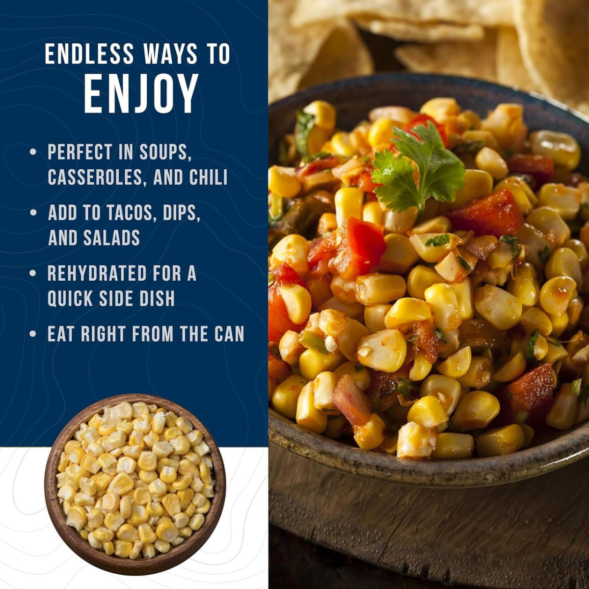 Сублімована солодка кукурудза у вашому запасі продовольства на випадок надзвичайної ситуації відкриває перед вами широкі можливості для приготування страв як у критичній ситуації, так і в повсякденному житті. Її можна їсти прямо з банки (за смаком вона як попкорн!), додавати в салати або тако як хрустку домішку, а також додавати в овочеві суміші для походів або кемпінгу. Її також можна легко приготувати як гарнір або використовувати в таких стравах, як супи, чилі, запіканки й багато іншого.