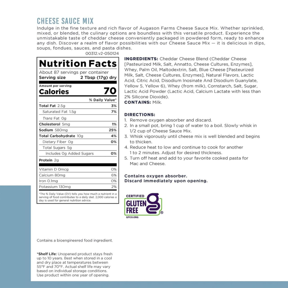 БЛЮДА БЕЗ ГЛЮТЕНА, ГОТОВІ ДО ПОТРЕБЛЕНІЮ — Сирна суміш для соусу Augason Farms — це сертифікований сир без глютену та трансжирів, який можна використовувати як універсальний продукт для приготування вечері або сирних закусок.