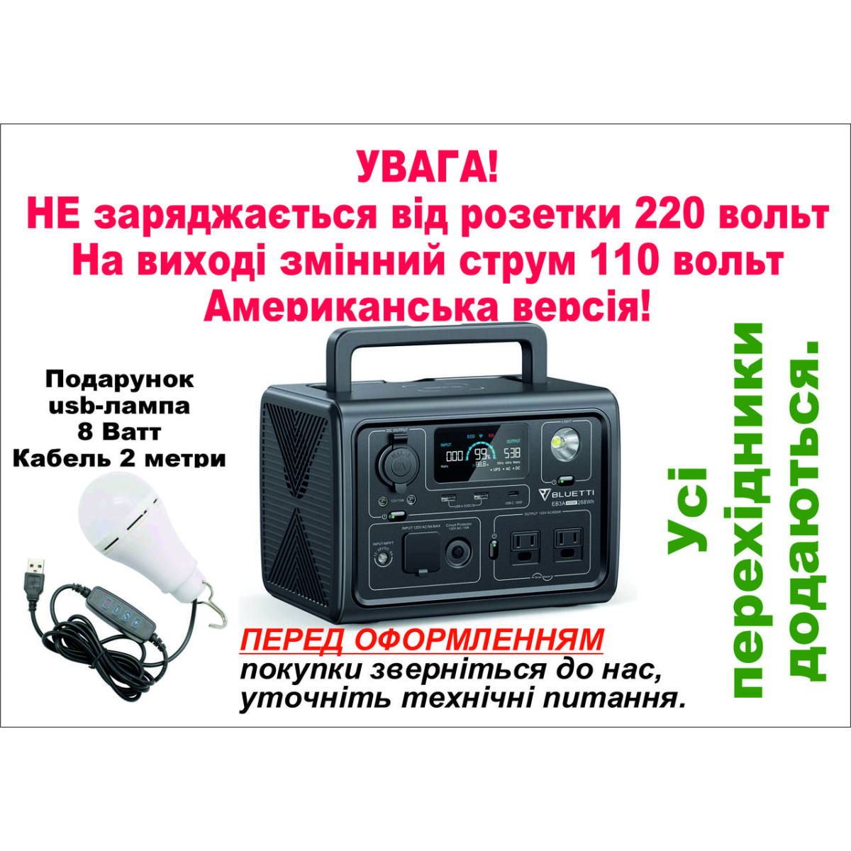 Окремо потрібно купити перетворювач напруги від 220 Вольтів на 110 Вольт (за допомогою якого ви зможете заряджати від розетки 220 Вольт не тільки цю станцію, але й будь-які інші товари зі США, потужність перетворювача потрібно підібрати за своїми потребами, не менш ніж 600 ватів).