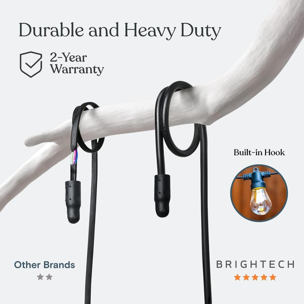 Всепогодні світильники для патіо комерційного класу з небитканими лампами S14: підвісний гірляндний світильник Brightech Ambience Pros обладнаний нашою технологією WeatherTite — витримує вітер швидкістю до 80 км на годину, дощ і сніг. Лампи являють собою небиткі пластикові корпуси, термостійкістю до 122 градусів за Фаренгейтом. Гнучкий надміцний шнур витримує знос під час використання всередині та зовні приміщень.